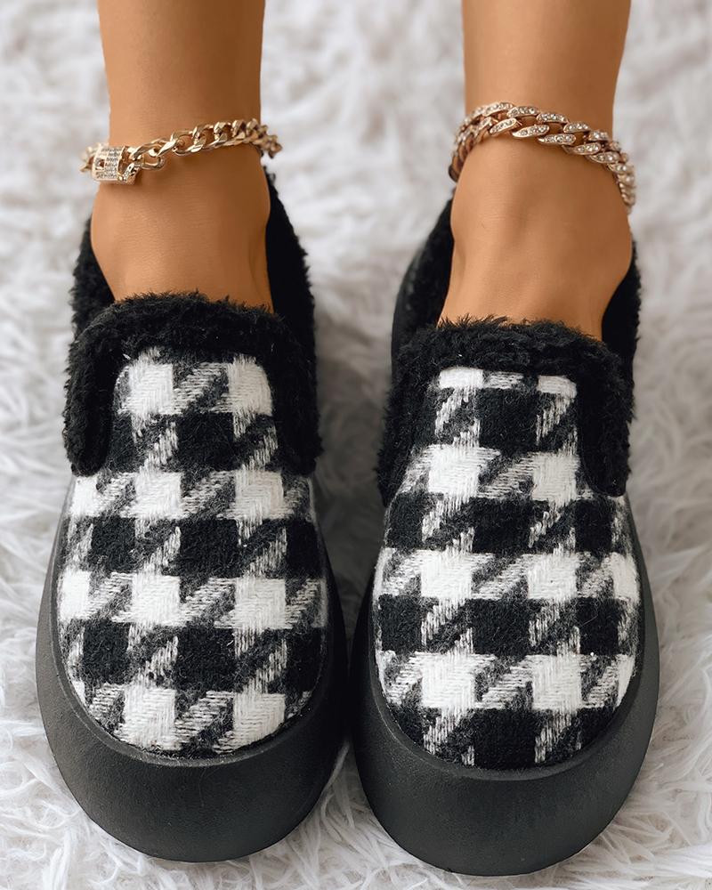 Houndstooth Pattern Fluffy Slip On Shoes, Black