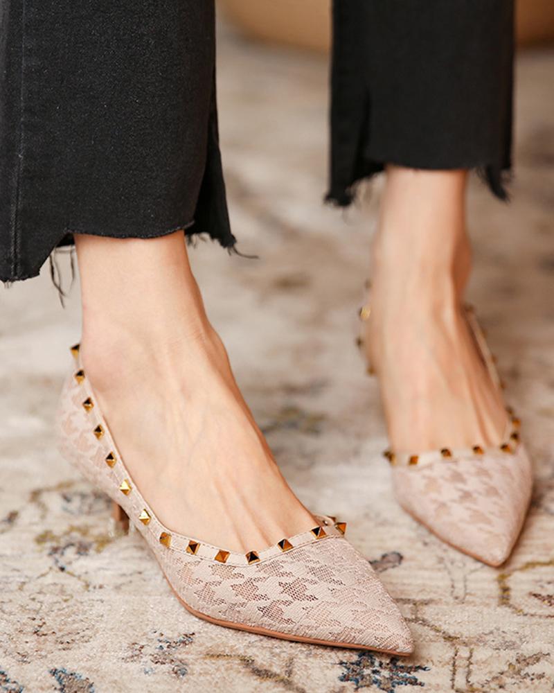 Houndstooth Pattern Studded Pointed Toe Heels, Apricot