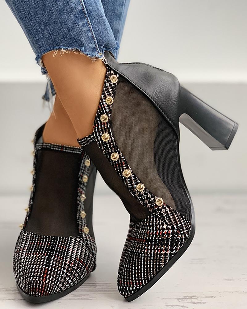 Houndstooth Rivet Sheer Mesh Chunky Heels, Khaki