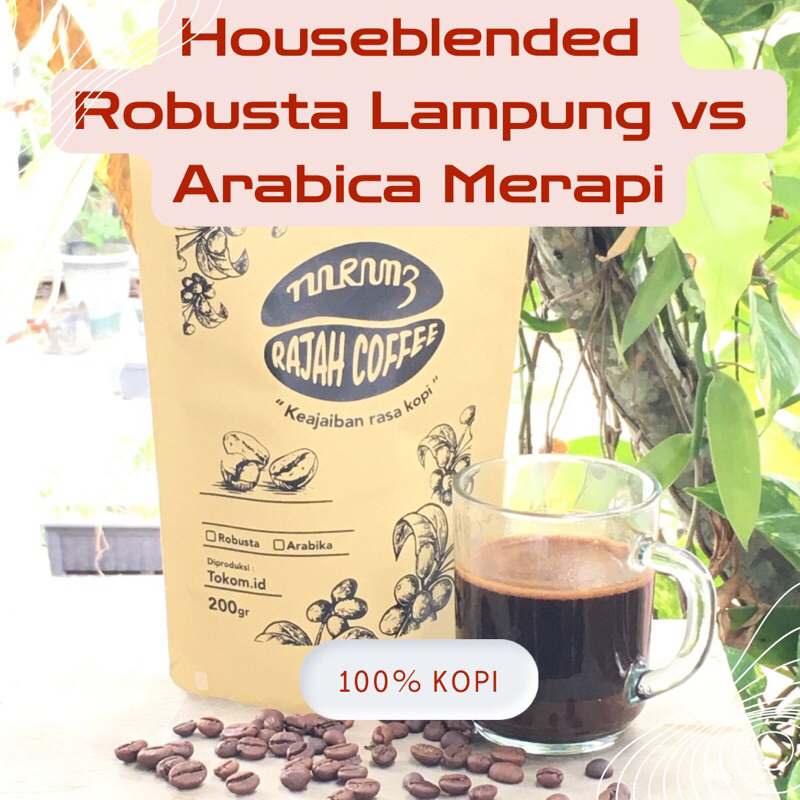 Houseblended atau kopi campur dari Kopi Rajah, perpaduan kombinasi percampuran dan persekutuan antara kopi robusta lampung dengn arabika merapi dengan perbandingan rasio 50:50.