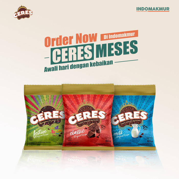 Meses Ceres merupakan butiran coklat populer yang telah menjadi meises pilihan utama masyarakat Indonesia. Ceres biasanya dijadikan sebagai toping utama memakan roti untuk sarapan. Namun kini, meises Ceres telah mantap menjadi pilihan utama untuk menjadi toping berbagai jenis makanan, seperti kue terang bulan, donat, cake, kue cubit, hingga ke variasi minuman. Tersedia pada berbagai pilihan rasa yang dapat Anda jadikan pilihan utama toping sehari-hari Anda.