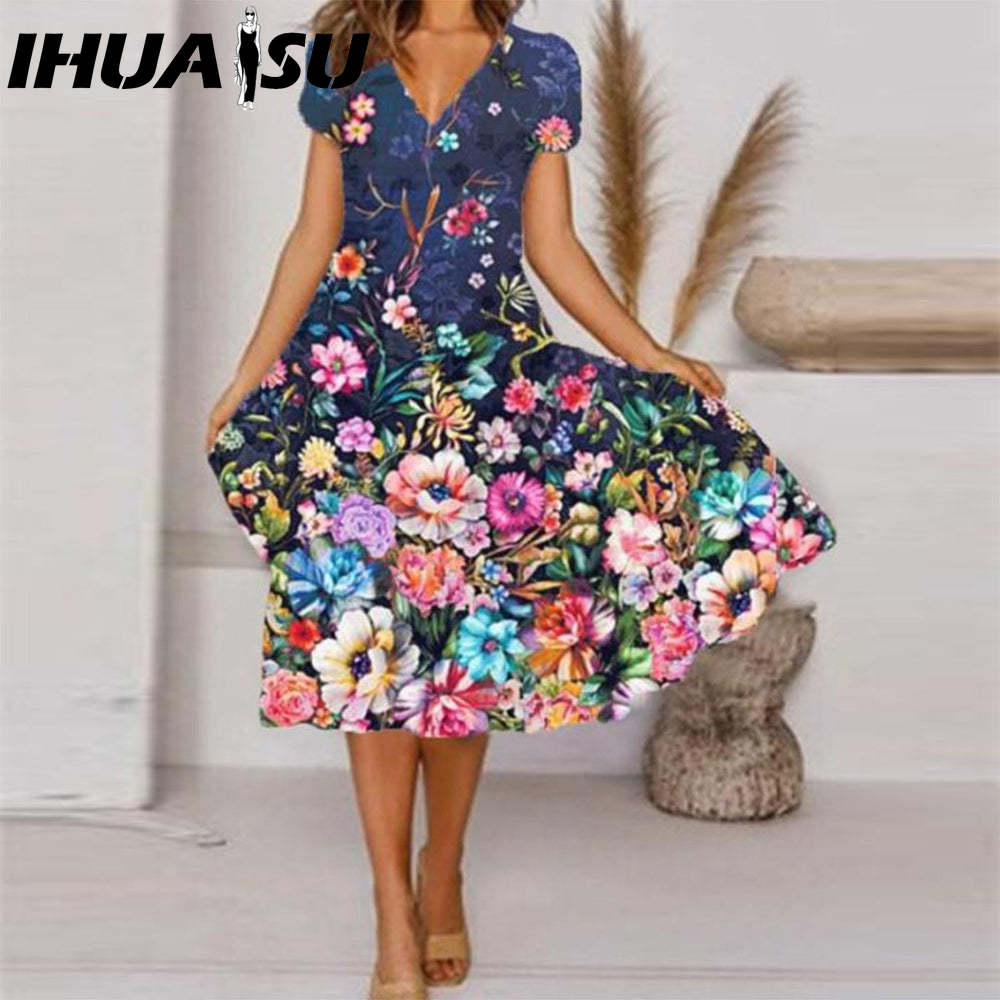 IHUASU Платье миди с V-образным вырезом больших размеров, с коротким рукавом и высоким подолом, повседневное, с красочным цветочным принтом XXXXXL