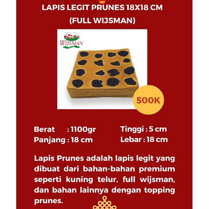 Waiki Lapis legit Prunes adalah lapis legit yang dibuat dengan bahan premium dengan full kuning telur, full wijsman, dan topping prunes disetiap lapisannya
