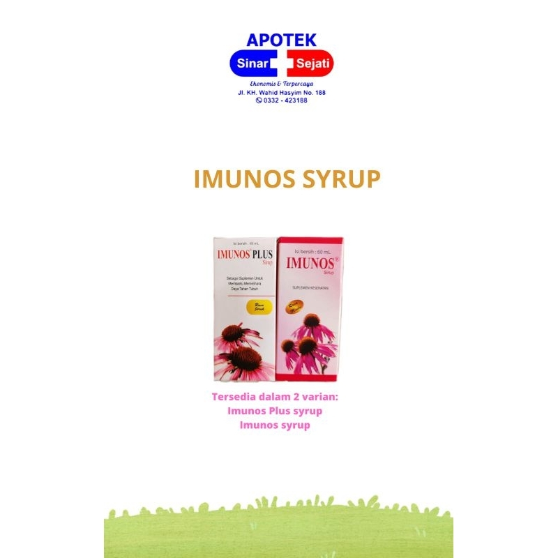 IMUNOS SIRUP merupakan suplemen yang mengandung echinacea purpurea extract, zinc picolinate, dan selenium yang digunakan untuk memelihara daya tahan tubuh.