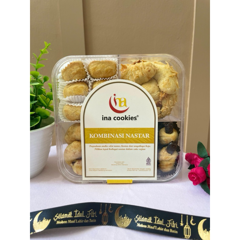 ina cookies kombinasi nastar terdiri dari nastar keju, nastar polos, milky nastar dan nastar kurma.