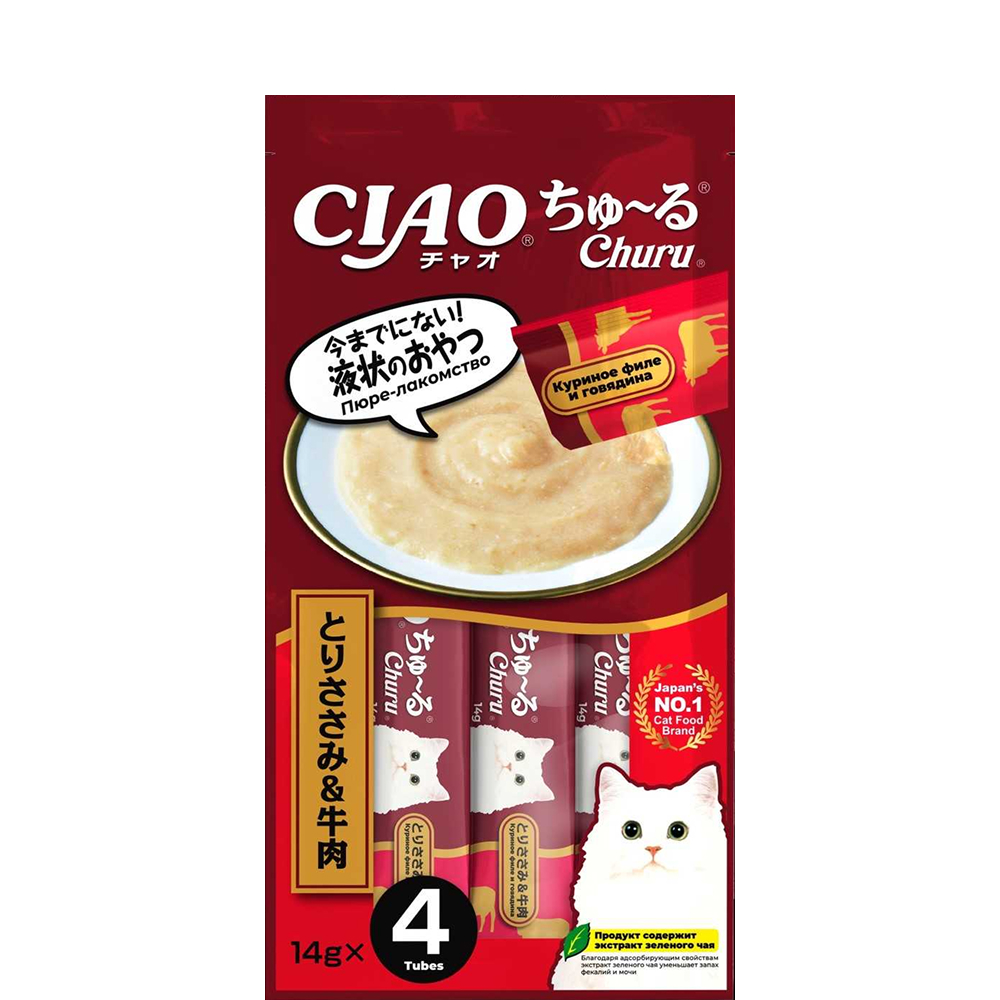 INABA CIAO Лакомство-пюре Churu Куриное филе и говядина для кошек, 4х14 гр.