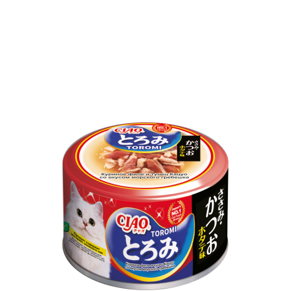 INABA CIAO Toromi Влажный корм (консервы) для кошек, куриное филе и тунец кацуо со вкусом морского гребешка в бульоне, 80 гр.