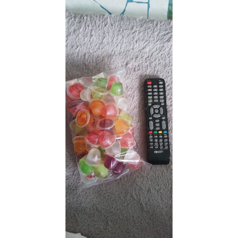 - jelly dengan aneka rasa buah seperti strawberry, grape, pineapple, lychee, orange, mango, melon