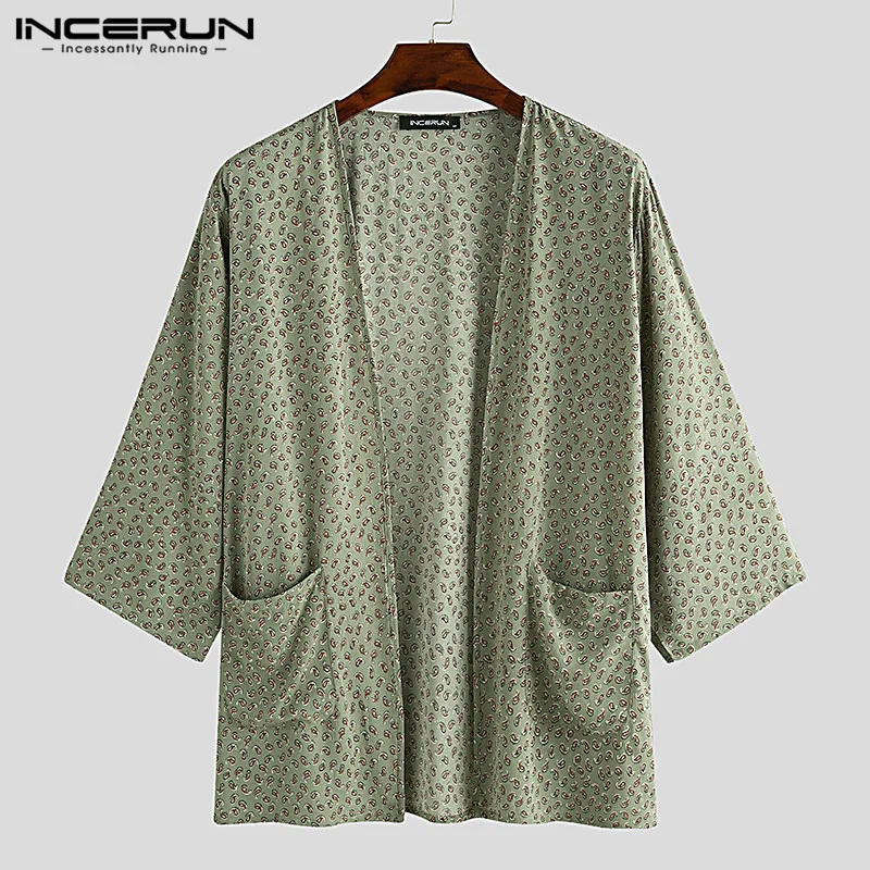 INCERUN Мужская рубашка с принтом 3/4 рукав кардиган с открытым стежком и карманами модные кимоно Харадзюку; Повседневные уличные Топы Camisas 2021