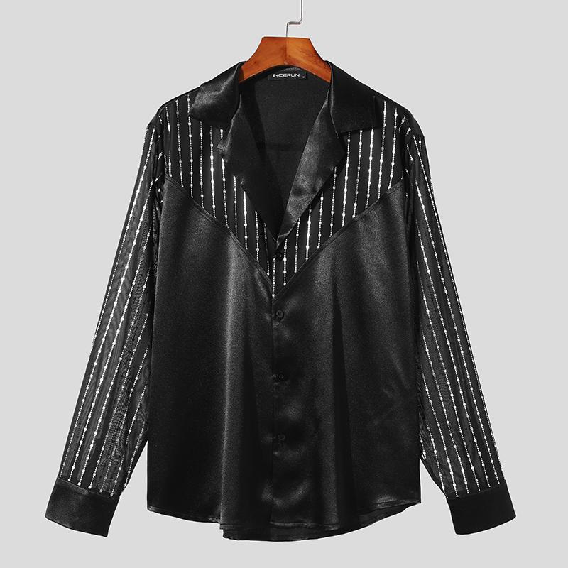 INCERUN Мужские блестящие атласные элегантные лоскутные рубашки с V-образным вырезом и длинными рукавами S