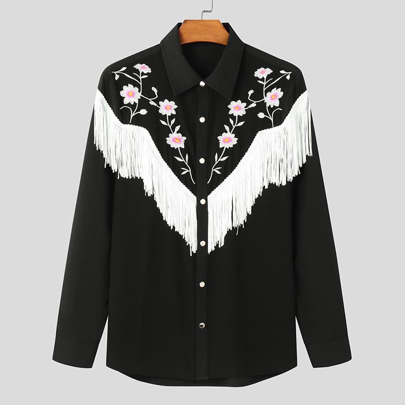 INCERUN Мужские весенние рубашки с длинным рукавом и вышивкой на пуговицах, повседневные топы 5XL чёрный