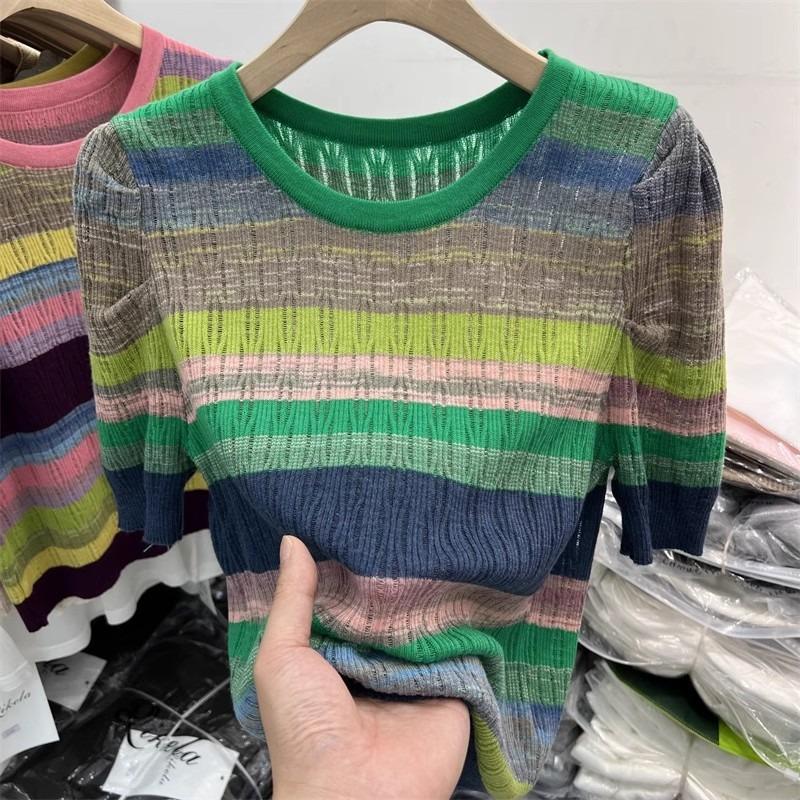 INDFS Женская мода Повседневная Летняя Весна Полосатый Принт Короткие Рукава О-Образный Вырез Блузки и Рубашки Size: One Size зелёный