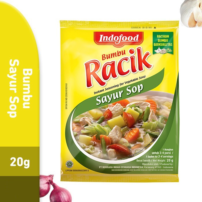 1 bungkus Bumbu RACIK Sayur Sop cukup untuk 1x masak untuk 3-4 porsi. Cocok untuk aneka jenis sop seperti sop ayam, sop jagung, sop makaroni, dan kreasi sop favorit keluarga.