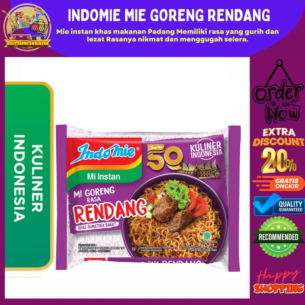 Indomie Goreng Rendang terbuat dari tepung terigu berkualitas dengan paduan rempah sampai rempah pilihan terbaik serta diproses dengan higienis menggunakan standar internasional dan teknologi berkualitas tinggi Juga dilengkapi tambahan fortifikasi mineral dan vitamin A B1 B6 B12 Niasin Asam Folat dan Mineral Zat Besi yang dibutuhkan tubuh.