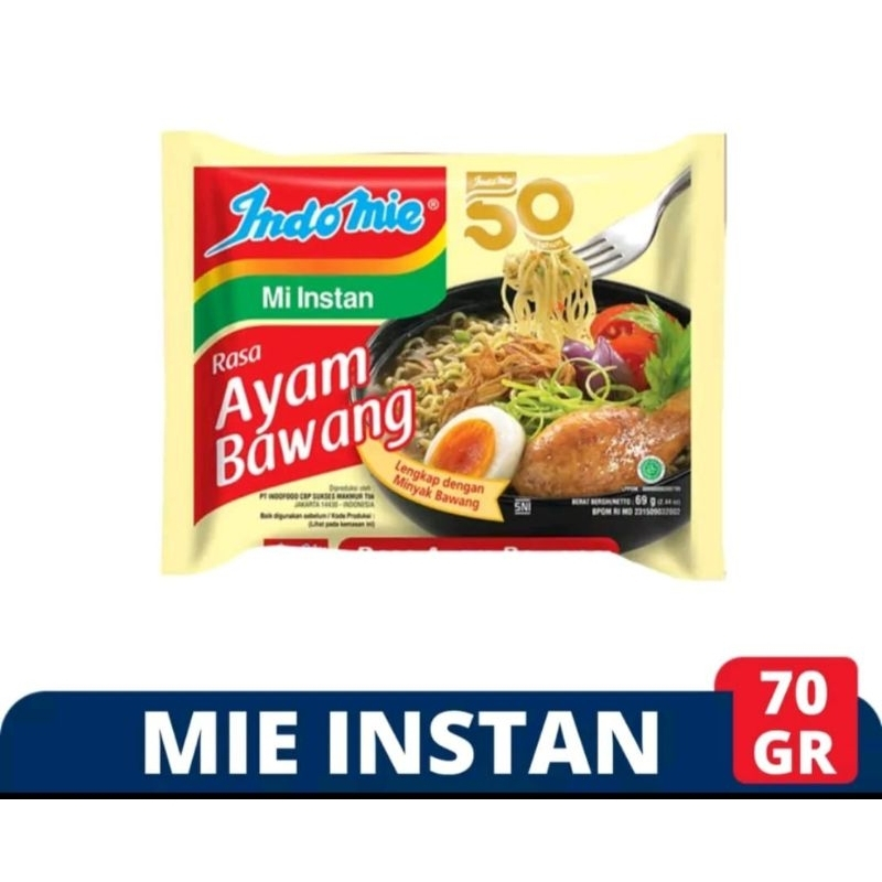 Indomie Rasa Ayam Bawang adalah mi instan kuah rasa ayam bawang yang dilengkapi dengan minyak bawang dan cabe bubuk.