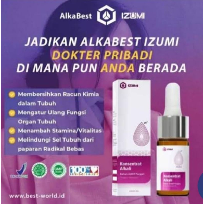 IZUMI ALKABEST merupakan konsentrat alkali yg terbuat Dari natrium,calcium,magnesium,zinc,zat besi,dll. yg dilarutkan kedlm air murni menggunakan energi listrik Teknologi Jepang dgn sistem elektrolizer sehingga mampu membantu mengatasi berbagai macam penyakit