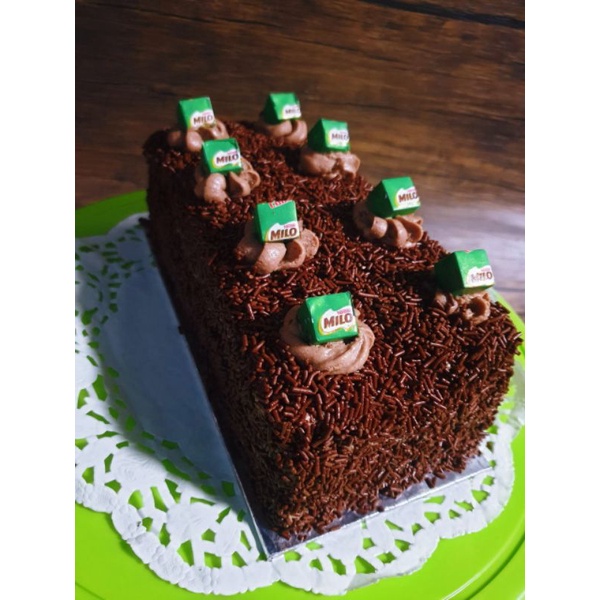 Ice Milo Cake, bolu pandan dengan balutan whipped Cream yg lembut ditambah meses ceres yg ga getir dilidah sangat nikmat disajikan dingin.