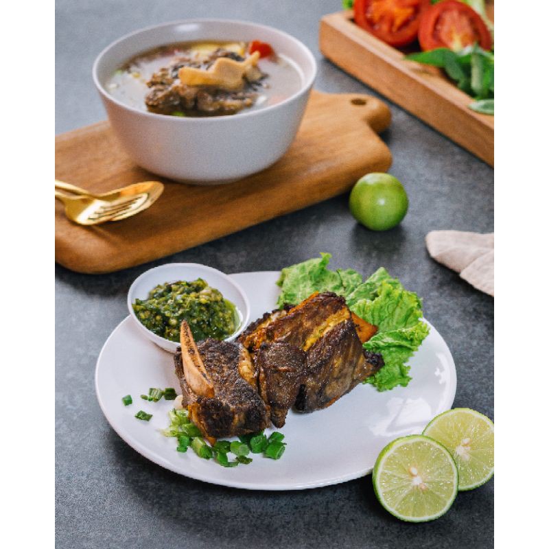 Iga sapi goreng dengan cocollan serasi sambal goreng cabe hijau./ sambal tomat merah.