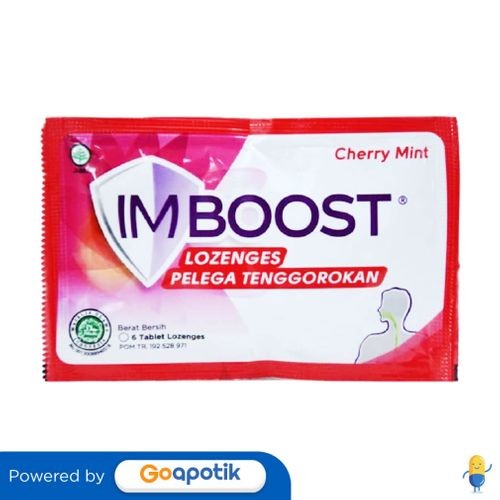 Deskripsi: Imboost lozenges dengan rasa cherry mint bekerja aktif membantu melegakan tenggorokan. | Komposisi: Tiap tablet mengandung Echinacea purpurea herba dry extract 50 mg | Dosis: 1 tablet 1 kali sehari | Indikasi: Digunakan Untuk membantu melegakan tenggorokan. | Perhatian Khusus: Hentikan permakaian jika terjadi reaksi alergi. Tidak dianjurkan digunakan lebih dari 8 minggu.Hindari penggunaan pada wanita hamil dan menyusui | Kemasan: 1 sachet @ 6 tablet hisap | NIE: TR192528971