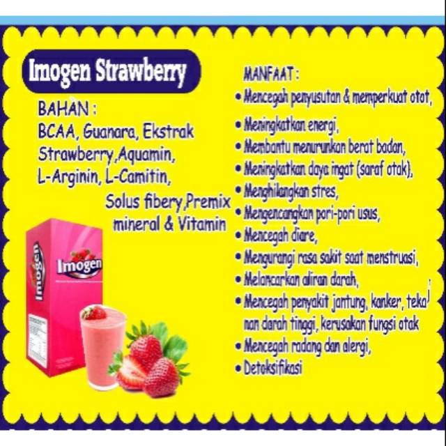 Imogen strawberry cocok banget buat menurunkan berat badan, boleh nyoba minum imogen strawberry, dan masih banyak manfaat lainnya boleh lihat pada gambar, isi 20 saset/box