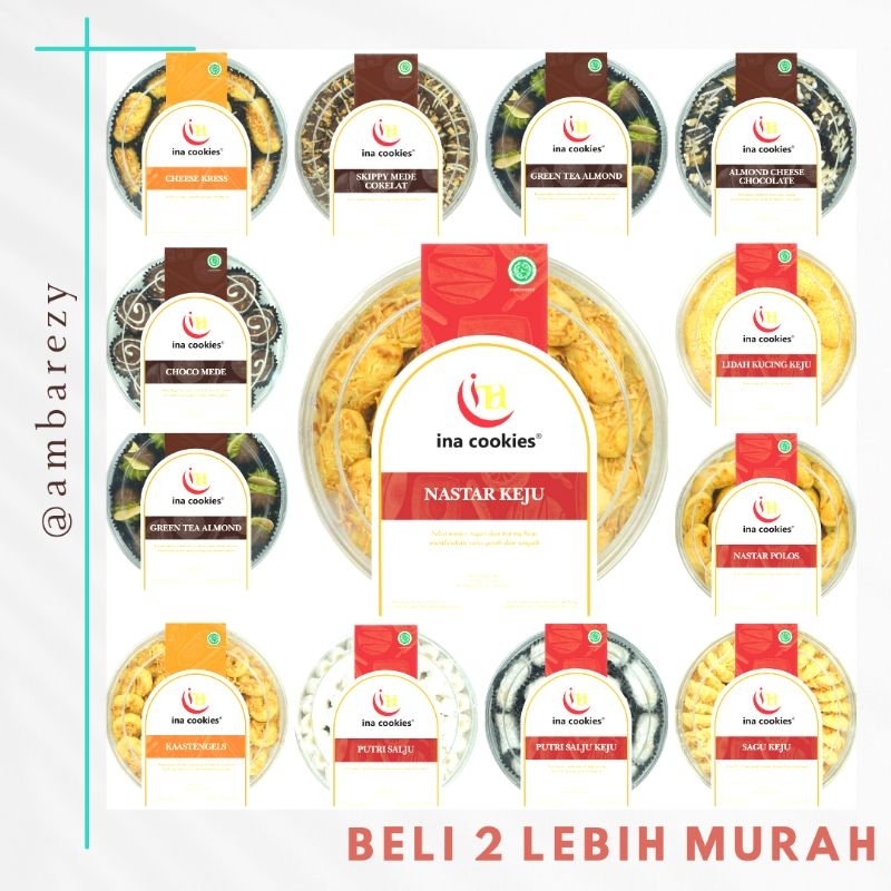 Cheese kress, kaastengels, putri salju, red velvet, skippy mede coklat, Skippy mede putih, sagu keju, nastar keju, putri voula/cheesy white almond, greentea almond, putri coklat, putri ice cream, Choco almond vegan, Putra fakhri/ Belgian Choco almond, peanut butter