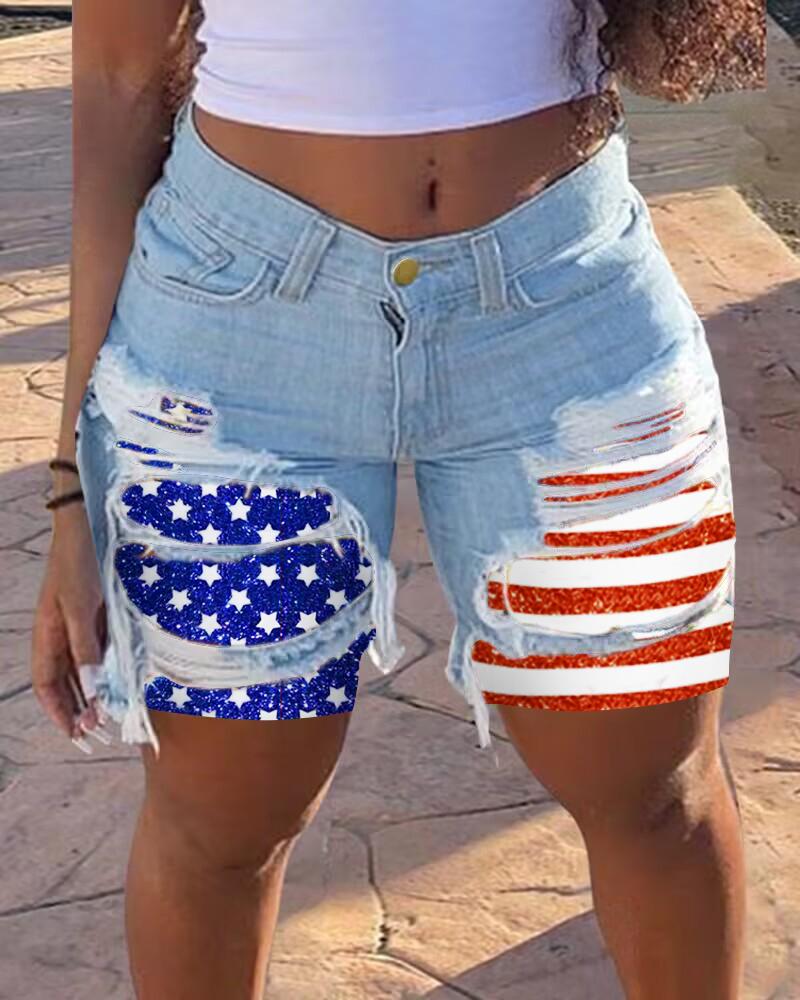 Independence Day Flag Print Buttoned Ripped Raw Hem Denim Shorts, Blue