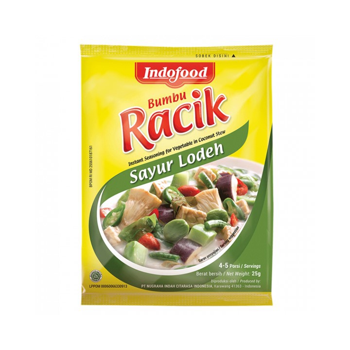 Indofood Bumbu Racik Sayur Lodeh 25gr merupakan bumbu instan untuk membuatsayur lodeh yang nikmat. Diproses secara higenis dan praktis : 43636 BPOM: MD 255610187161