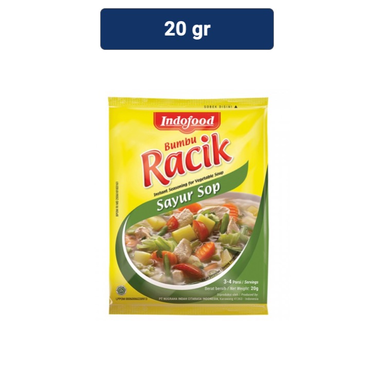 Indofood Bumbu Racik Sayur Sop 20gr merupakan bumbu instan untuk membuatsayur sop yang nikmat. Diproses secara higenis dan praktis : 43636 BPOM: MD 255610183161
