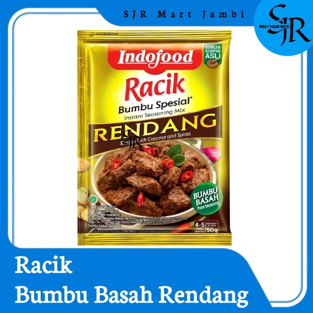 Indofood Racik Bumbu Spesial Rendang 50 g adalah salah satu bumbu instan yang dipersembahkan oleh Indofood untuk masakan rendang yang lezat dan nikmat. Bumbu Indofood ini diracik dari perpaduan bumbu dan rempah-rempah alami yang segar. Perpaduan tersebut dihasilkan dari pasteurisasi yang menjaga kesegaran rempah