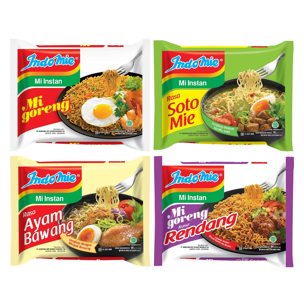 Indomie, mie instant goreng, soto mie, ayam bawang, rendang