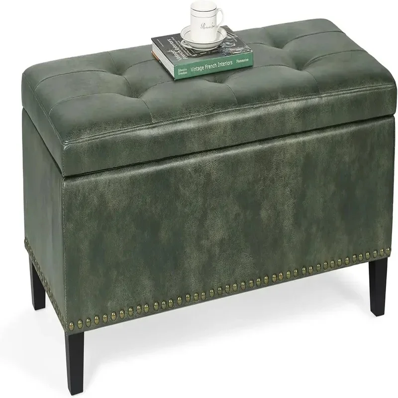 Ink Green Rectangular Faux Leather Storage Ottoman Bench with Wood Legs Footstool