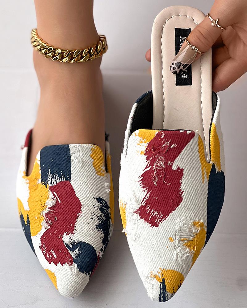 Ink Splash Print Ripped Slippers Point Toe Mules, Multicolor