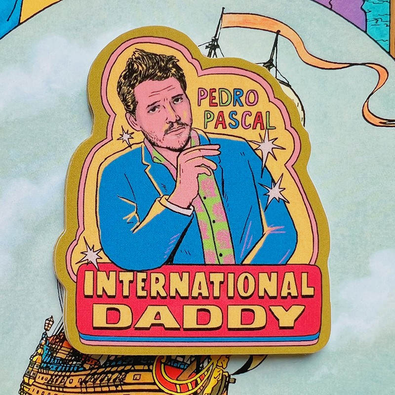 Stiker bergambar Pedro Pascal sebagai si Bapak Internasional.