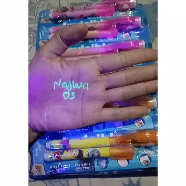 Pulpen ini hanya akan bisa dilihat tulisanya saat senter dikepala pulpenya di arahkan ketulisan.