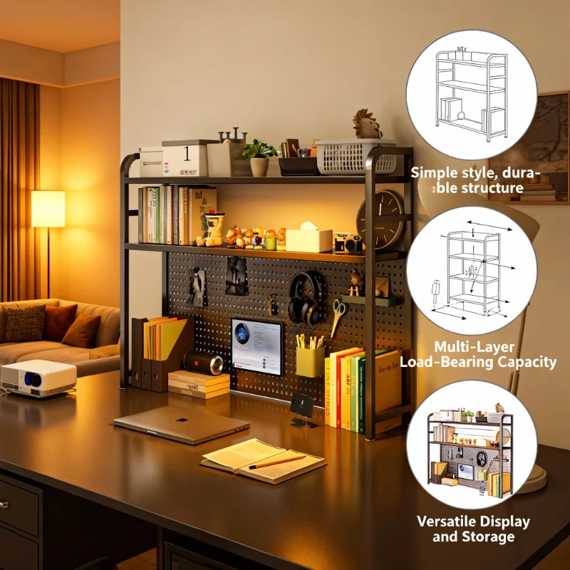 Iron Desktop Pegboard Bookshelf Multi Tier Desk Organizer Storage Shelf Student Computer Workstation Rack Bookcase Furniture