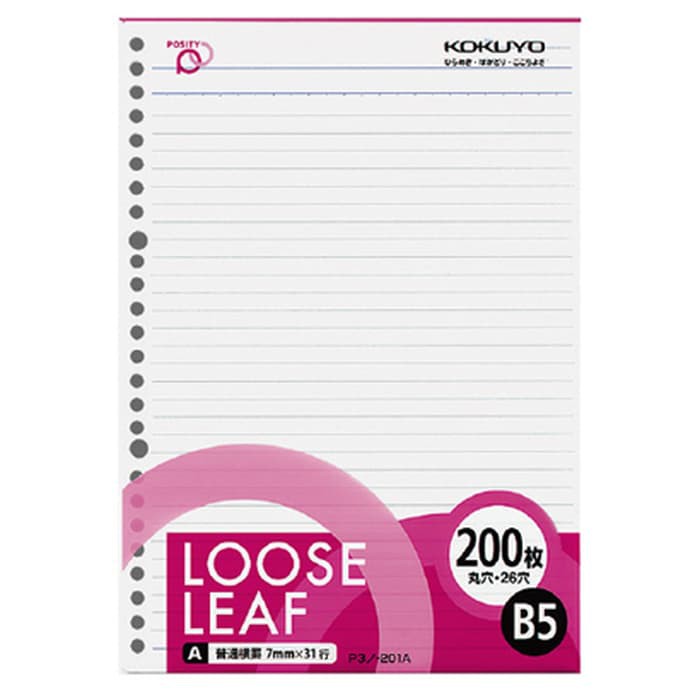 KOKUYO LOOSE LEAF POSITY B5 -7mm ruled lined - 200sheets -26holes