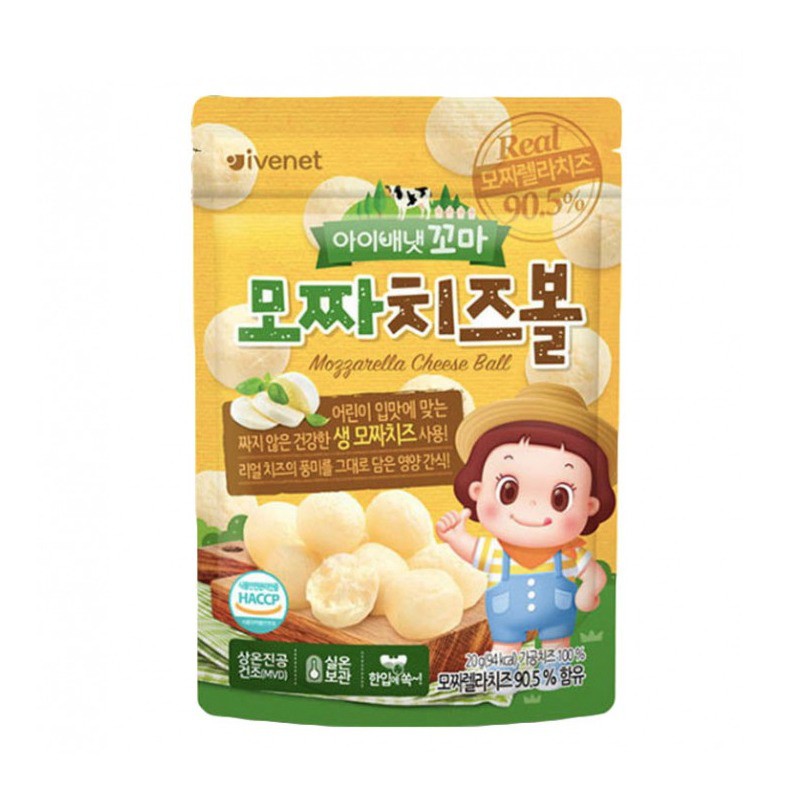 Berat produk: 20 gramAsal produk: KoreaRekomendasi umur: 2 tahun keatasIvenet Mozza Cheese Ball merupakan snack bola-bola keju untuk anak yang menggunakan bahan keju fresh dan tidak asin.Mozza Cheese Ball merupakan pilihan bunda sebagai snack yang sehat. Dapat digunakan sebagai topping pada soup ataupun salad.