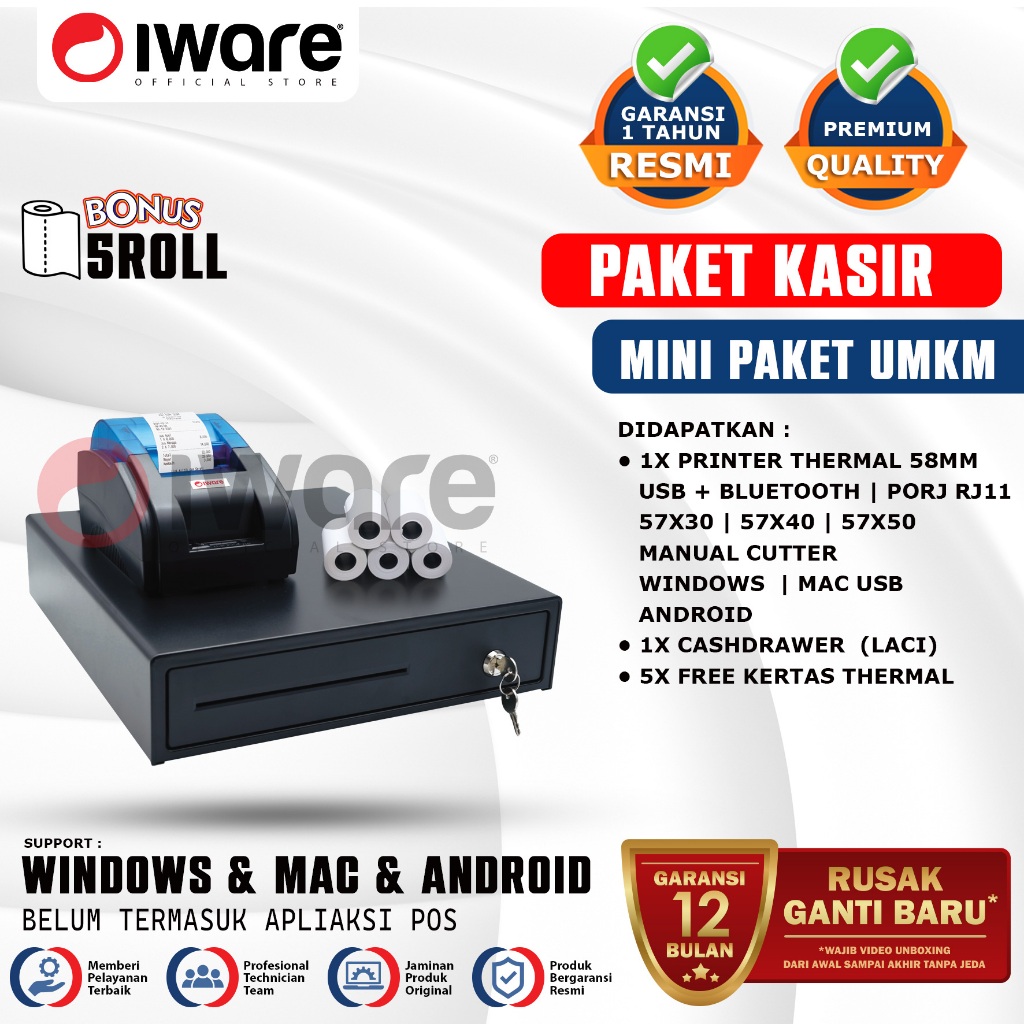 Iware Paket Kasir Android, Printer Bluetooth, Cash Drawer Free Kertas 5 Roll