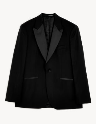 This elegant tuxedo jacket from Jaeger is crafted from fine pure wool, woven at the Italian Marlane mill. It's cut to a tailored fit with wider shoulders and a lightly tapered waist for a modern take on a classic jacket. A classic single-breasted style that fastens with a single button. The half-canvas construction makes this jacket lightweight and allows it to mold elegantly to the body. Twin back vents also ensure that you can move and be seated with ease. nThe lapels, jetted pockets and buttons are finished in satin to create discreet and refined details. Inside, a bespoke Jaeger straw-jacquard lining ensures a luxurious finish inside and out and working button cuffs provide a premium finish. nTeam with matching trousers, a Jaeger Marcella bib dinner shirt and formal accessories for the ultimate event style.
