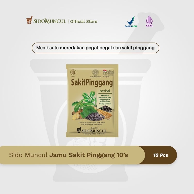 Sido Muncul Jamu Sakit Pinggang merupakan jamu untuk membantu mengobati gangguan-gangguan pada pinggang, seperti pegal-pegal dan sakit/nyeri pada daerah pinggang, serta badan lesu tak bertenaga. Juga, Sido Muncul Jamu Sakit Pinggang dapat melancarkan air seni.