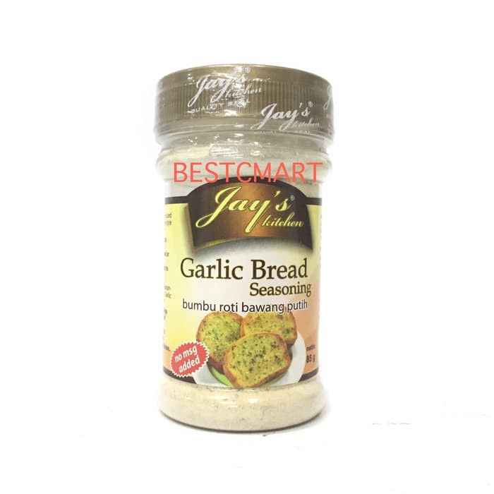 JAY'S GARLIC BREAD SEASONING ( BUMBU ROTI BAWANG PUTIH )Jays Garlic Bread Seasoning is used to make authentic restaurant-style garlic bread.- Mix 1 tbs butter with 1 tsp Garlic Bread Seasoning - Spread onto French bread or your favourite bread - Toast until golden. Ready to serve.NETTO : 85 GR