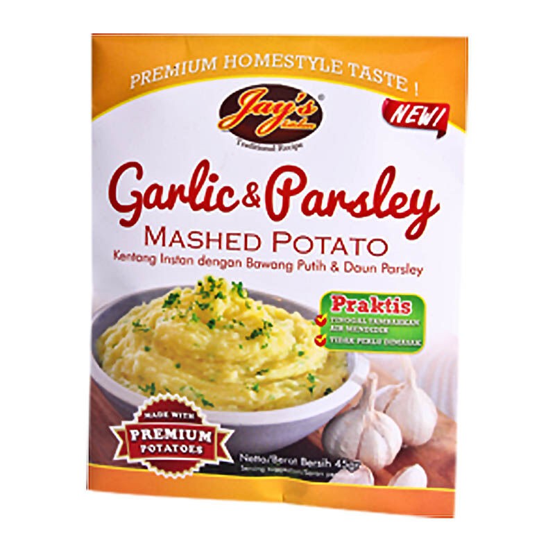 Jay's Mashed Potato Garlic & Parsley merupakan kentang instan yang diolah dari kentang pilihan (premium) dengan paduan bawang putih dan daun peterseli. Kentang ini dapat disajikan sebagai hidangan pendamping yang tepat bagi momen santap yang lezat. Cukup tambahkan air panas dan mentega tawar, kentang dengan tekstur yang halus dapat langsung Anda nikmati. Rasakan cita rasa terbaik dalam hidangan Anda dengan menyantap kentang persembahan dari Jay's.