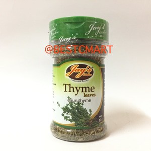 JAY'S THYME LEAVES (DAUN THYME) Produk ini terbuat dari daun thyme pilihan- murni & alamai- serta berkualitas- diproduksi dengan mesin modern- tanpa bahan pengawet. Daun thyme kering siap pakai ini sangat praktis diolah dengan kandungan antioksidan yang tinggi dapat mengurangi resiko penyakit jantung dan kanker- sehingga produk ini aman dikonsumsi oleh siapa saja. Daun ini dapat ditabur pada berbagai masakan- seperti pizza- spaghetti- burger hingga masakan kesukaan Anda lainnya. Halal MUI.