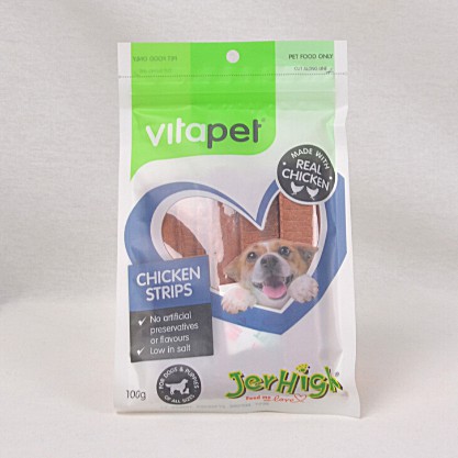 Real chicken meat!Jerhigh snacks are made of chicken meat. They are carefully prepared to providea pure, tasty and highly digestible snack. Jerhigh has goodness with nutritionalbenefits for your dog's well being. Jerhigh snacks are suitable for feeding as asnack, or reward to show your pet love.Ingredients:Chicken meat, vegetable protein, sucrose, dietary fiber, meat flavour, smokeflavour, antioxidant, colorant, mineral and vitamins.Size:100 gramsFeeding Guideline:Intended for intermittent feeding only. Serve as a treat or snacks. Ensureadequate amount of fresh and clean water at all times.