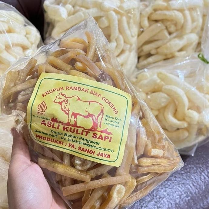 Krecek Rambak stik tebal yang terbuat dari 100% kulit sapi adalah produk yang dijual oleh F.a Sandi Jaya pusat krecek Rambak. Produk ini tersedia dalam partai dan eceran dengan kemasan 1 kg yang terdiri dari 1 bungkus dengan berat 500 gr. Warna kulit sapi yang digunakan tidak selalu sama dengan yang digambar karena asli dari kulit bukan dari tepung sehingga warna tidak bisa konsisten. Namun, rasa dan kualitas produk tetap konsisten.