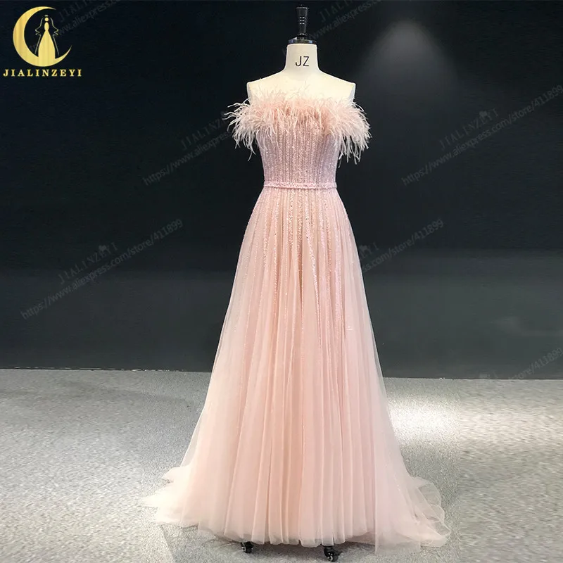 JIALINZEYI без бретелек, розовые с перьями, трапециевидные, роскошные вечерние платья из хаки, Новые Вечерние платья