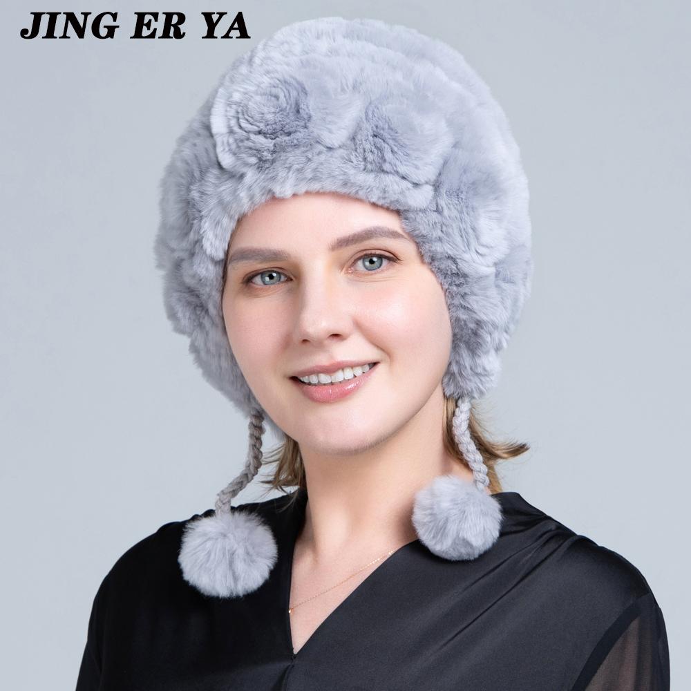 JINGERYA зимние шапки для девочек, женская меховая шапка из настоящего кролика Рекс, вязаная шапка с цветочным принтом и шариками, черепами, шапочки