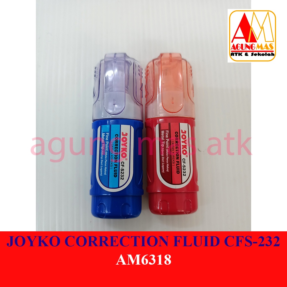 Correction Fluid Koreksi Joyko CFS-232, Ukuran Produk : Panjang 7.8 cm x Lebar 2.1 cm, Metal Tip ( Ujung Logam ), Fine Point ( Mata Pena Halus ), Tipe : Cairan, Warna : Merah dan Biru