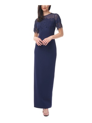 JS COLLECTION Женское темно-синее платье макси с иллюзорной кокеткой и короткими рукавами, Navy