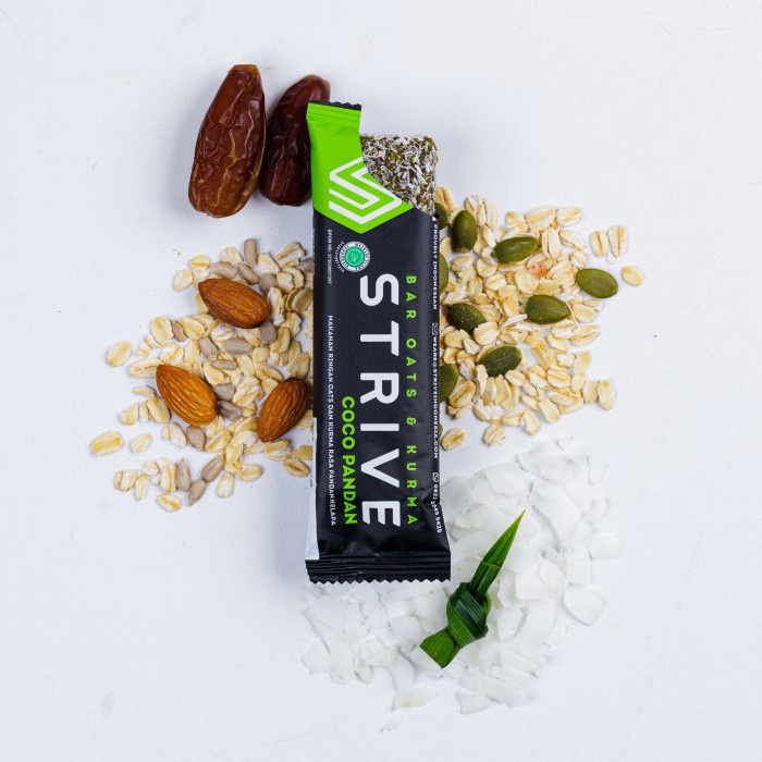 #34;CATATAN TOKO : Jadwal oprasional: Senin - Jumat, pukul: 8.30 - 17.30 Untuk pemesanan Sabtu, Minggu amp; hari Libur akan di proses hari Senin atau di hari kerja Strive Energy Bar Coco Pandan (Fullbar) - 40 gr Rasa: Coco Pandan Jumlah: 1 Box (6pcs) Apa Itu Strive? Strive Energy Bar, produk buatan Indonesia terbuat dari bahan dasar kurma, oats, kacang almond dan biji bunga matahari (tanpa gula tambahan dan bahan pengawet), yang padat gizi dan mengandung 200 kalori. Kapan Harus Mengkonsumsi Strive? Strive Energy Bar dapat digunakan untuk penambah tenaga dan penunda lapar saat berkegiatan seperti bersepeda, lari, hiking, dan olahraga lainnya. Strive Energy Bar dapat digunakan sebelum (pre), selama (during) dan sesudah (post) olahraga. Selain untuk olahraga, Strive Energy Bar juga baik di gunakan untuk snack sehat dan pengganti makanan buat kamu yang sibuk. Cara Penyimpanan: Untuk penyimpanan Mohon di simpan di tempat kering dan tidak di bawah sinar matahari. Informasi Nilai Gizi: Rasa Coco Pandan Takaran Saji 40g Kalori 200 Energi dari Lemak 80 Jumlah persajian 100g %DV Lemak Total 9gr 14% Lemak Jenuh 2g 10% Lemak Trans 0g 0% Kolesterol 0mg 0% Natrium / Sodium 75g 3% Karbohidrat Total 27g 9% Serat makanan 4g 16% Gula 16g Protein 5g 10% Kalsium 4% Iron 8% #34;